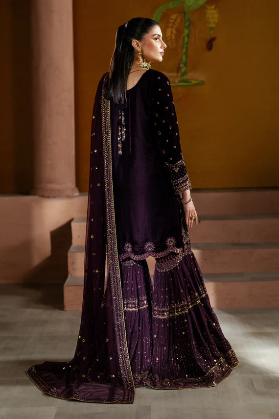 Elegant plum velvet gharara set with intricate embroidery and adda work. The shirt features a classic neckline with embroidered borders and fitted sleeves. The gharara has double-layered borders with spray work for a graceful fall. Net dupatta is finished with borders on all sides and center spray detailing.