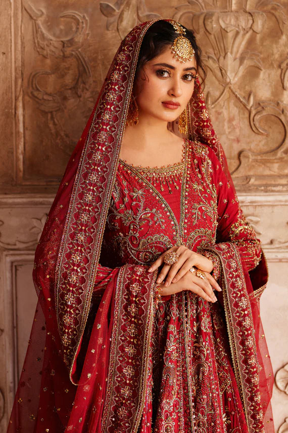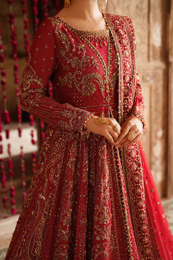 This exquisite ensemble is a true statement of elegance, crafted with meticulous detailing and timeless artistry. The peshwas features a length of fifty inches with a generous ninety-inch flare, enhanced by delicately embroidered and sequined adda work. The bodice is designed with refined proportions, flowing into eight panels, each finished with intricate borders that elevate its grandeur. A beautifully deep neckline with balanced width complements the silhouette, while the full-length sleeves carry central motifs and fine embellishments. The lehnga, with its graceful length and dramatic flare, is adorned with heavily worked borders that reflect masterful craftsmanship. Completing the look, the net dupatta showcases a four-sided border and subtle center spray, adding a touch of ethereal charm. Every element of this attire speaks of luxury, artistry, and sophistication, making it a perfect choice for special occasions.